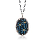 the blue daisy pendant is an easy-to-wear piece with a delightful hand-painted motif* set in a hand-fabricated sterling setting with asymmetric prongs. A mixed metal look with the gold luster center of blue daisies makes it easy to pair and layer with your other silver or gold jewelry.