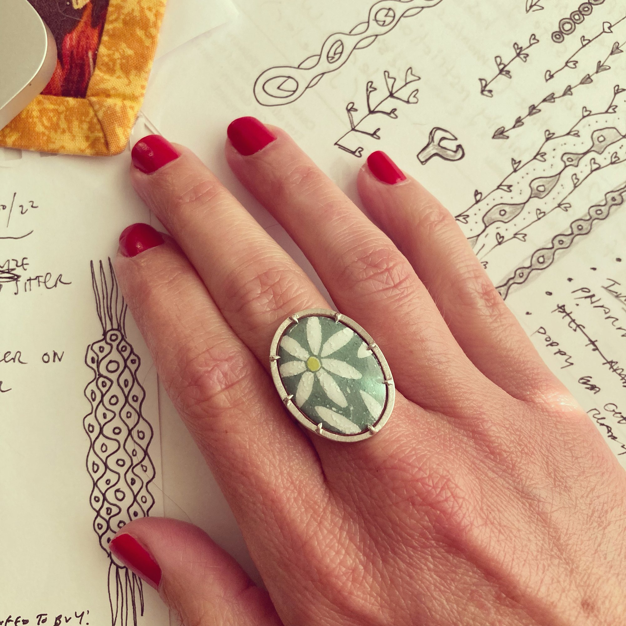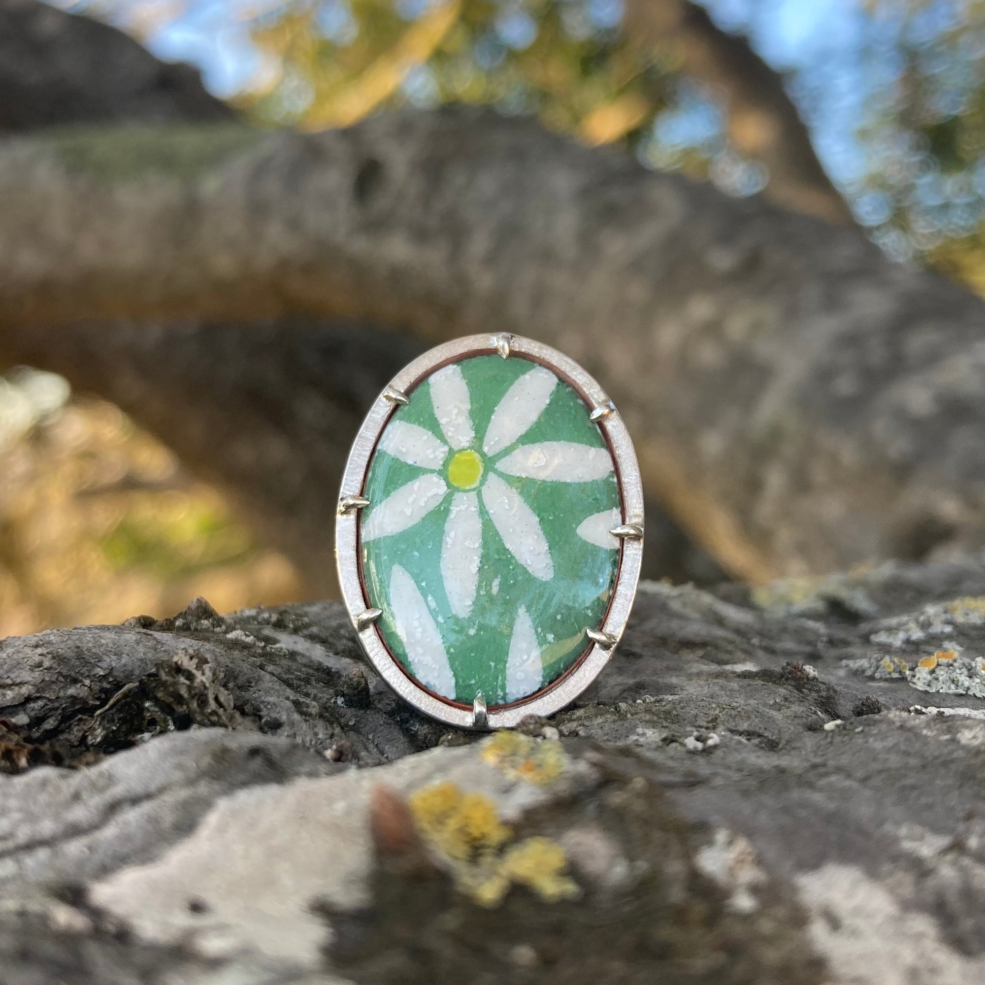 made of: enamel fired over slightly domed oval copper and prong set into a sterling silver setting — please allow for some very subtle variation in the daisy image, as these are hand drawn one at a time.