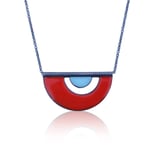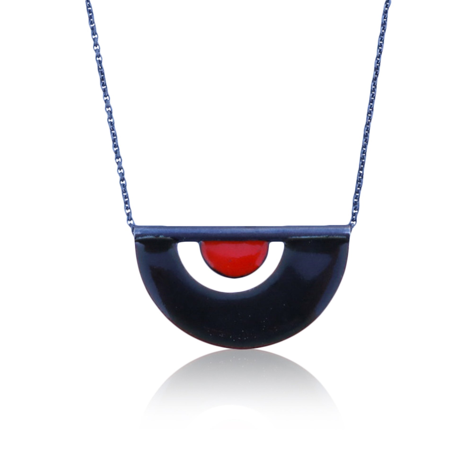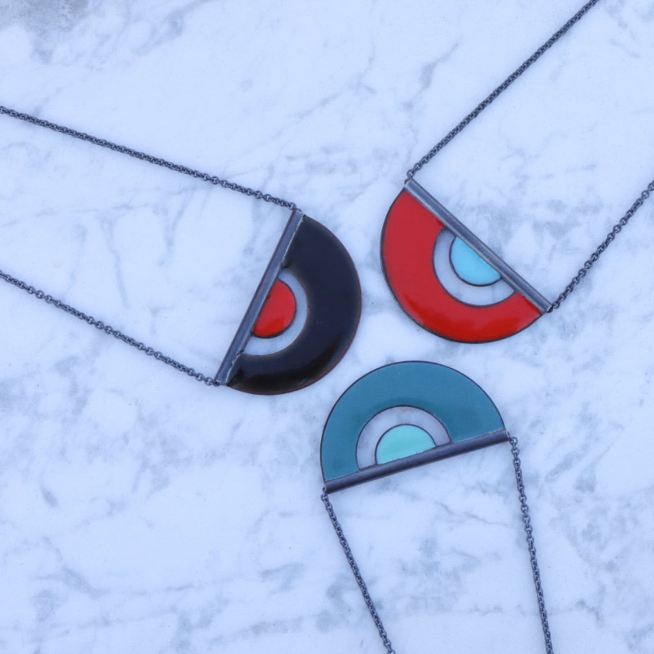 made of: oxidized sterling silver, vitreous enamel fired over copper (both sides of the necklace), oxidized sterling silver chain.