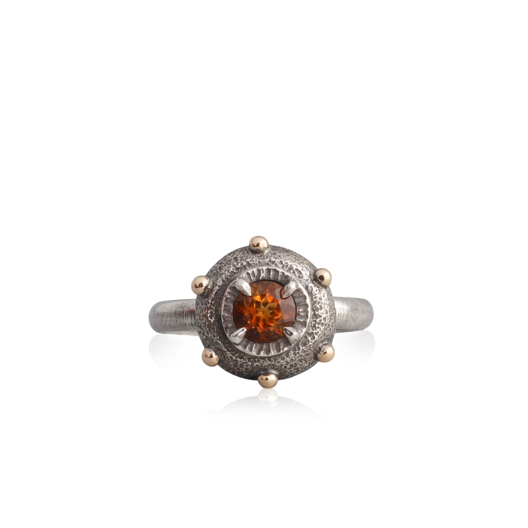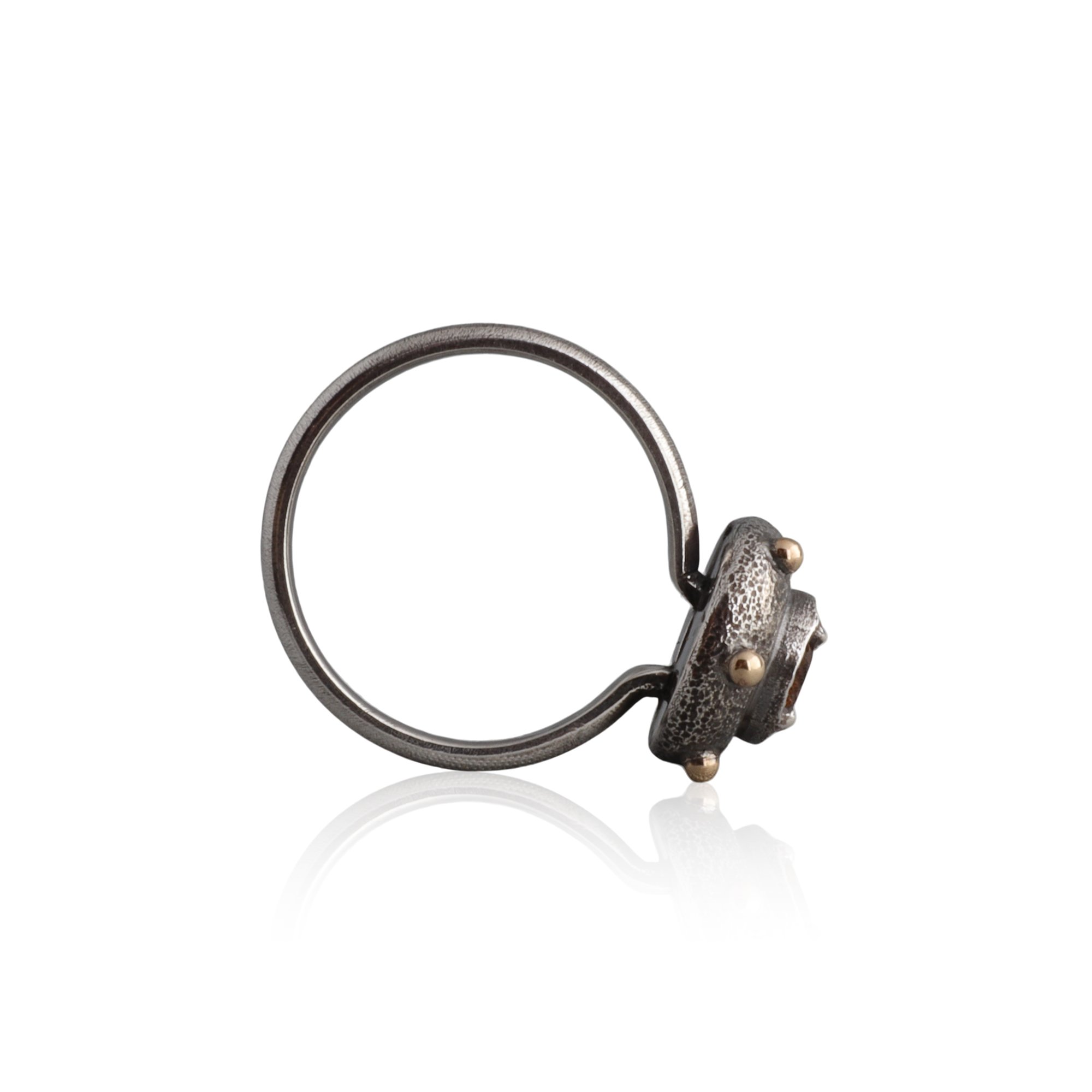 made of: oxidized sterling silver, 14k gold ball details, 5mm round faceted citrine